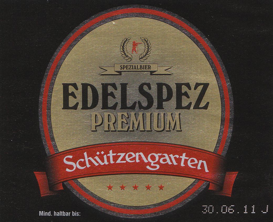 Vollständiger Titel: "Edelspez Premium". Das sagt uns noch nicht viel; welches Bier heisst schon nicht "edel" oder/und "premium"? Nun gut. Das Spez(li) von Schützengarten St. Gallen, 5.2 %. Im Mund zunächst süss und "Hopfen-fruchtig" (nicht zu verwechseln mit "Früchte-fruchtig"!), dann bleibt eine scharfe Bitterkeit haften. Man fühlt sich fast an Feldschlösschen erinnert. – Noch einen Schluck. Aha! Nimmt man mehr(ere) und grössere Schlucke (Schlücke?), macht sich in der Nasenhöhle die bekannte Schützengarten-Malz-Süsse breit, umhüllt von eben beschriebener Bitterkeit. Mit zunehmendem Konsum (keine Völlerei! wohlgemerkt, wir haben erst einen von drei Dezilitern) verschwindet die Bittere immer mehr hinter den Vorhang. Momou, ein gutes Bier.